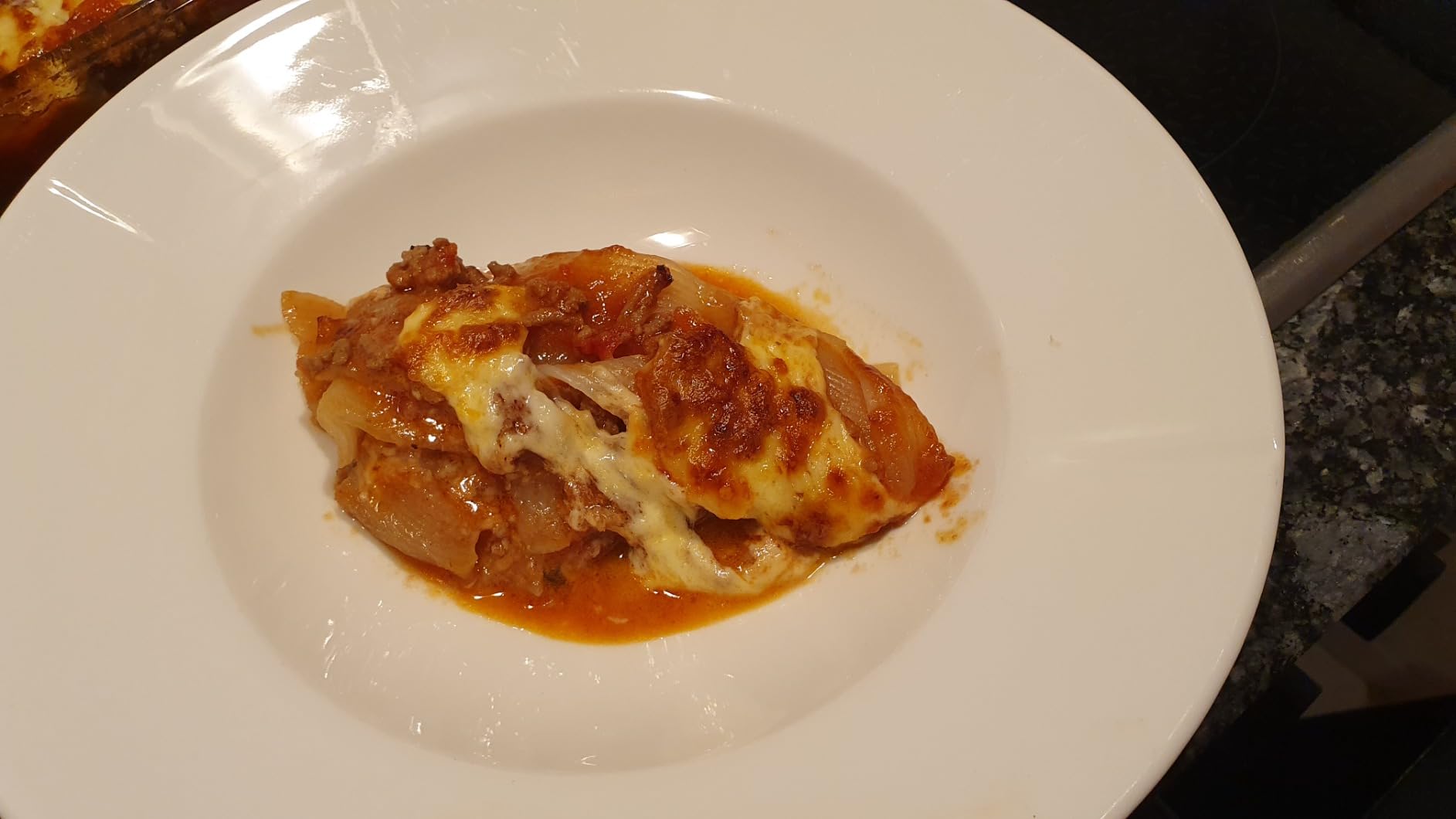 Wegen Ketodiät habe ich die Béchamelsauce weggelassen und nur eine gut gekürzte Hackfleischsauce mit einer Dose gehackter Tomaten verwendet und viel Reibkäse zwischen den Lagen. Zuoberst Mozarella.
