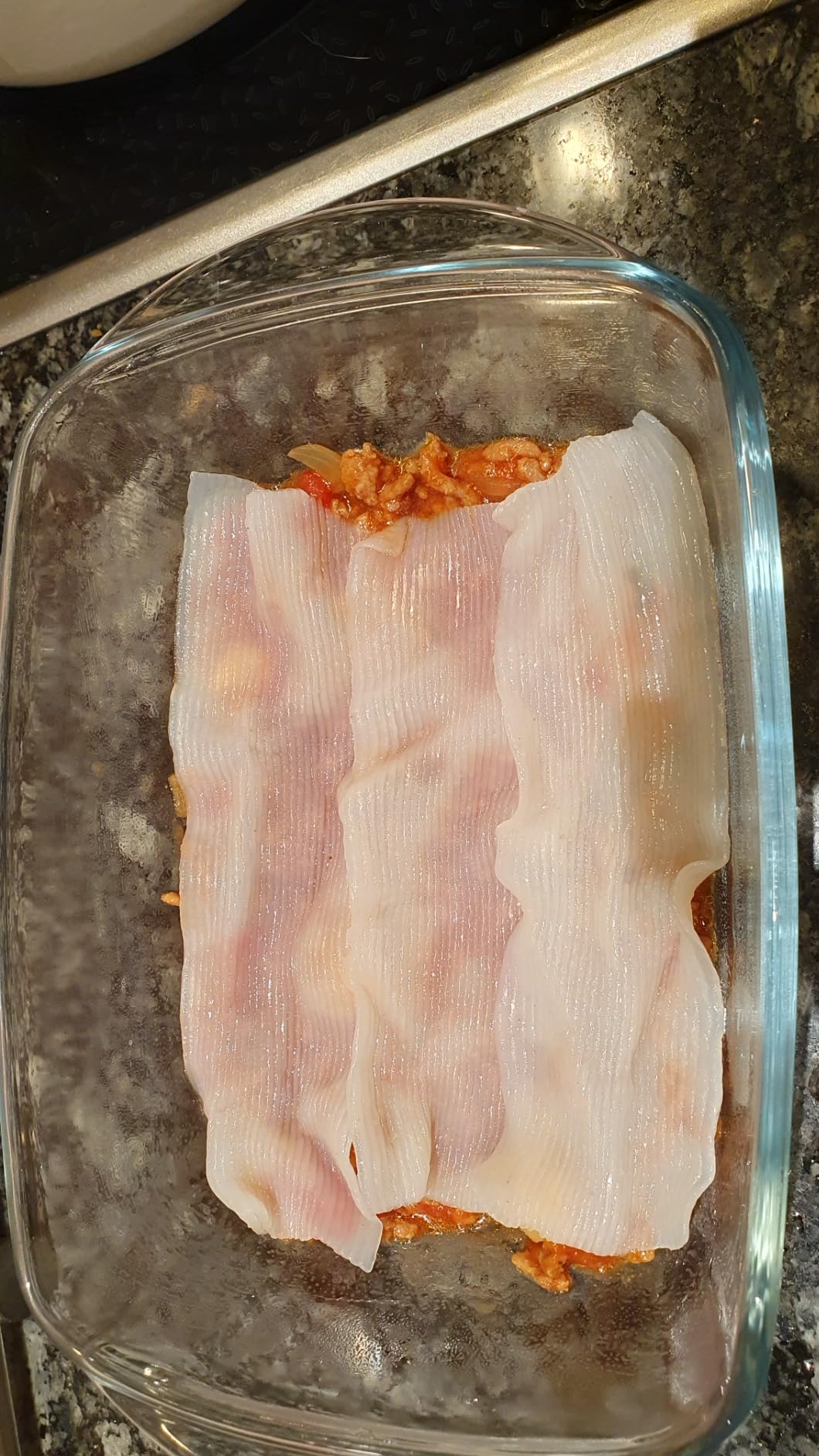 Saug nicht auf wie konventionelle Lasagneplatten, also weniger Flüssigkeit (oder Sauce dicker machen).